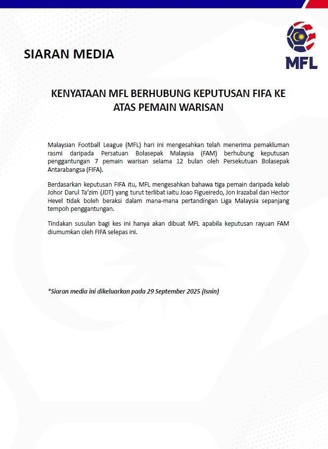 Malaysian Football League (MFL) hari ini mengesahkan pihaknya telah menerima pemakluman rasmi daripada Persatuan Bolasepak Malaysia (FAM) berhubung keputusan penggantungan tujuh pemain warisan selama 12 bulan oleh Persekutuan Bolasepak Antarabangsa (FIFA).